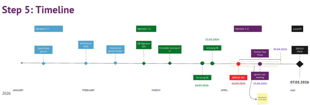 3. Bereitstellung in geocat.ch PROD: 07.05.2026 - Behebung der während der Testphase identifizierten kritischen Fehler. Am 7. und 8. Mai 2026 sind keine Änderungen in PROD möglich, um den Verlust Ihrer Änderungen zu vermeiden.