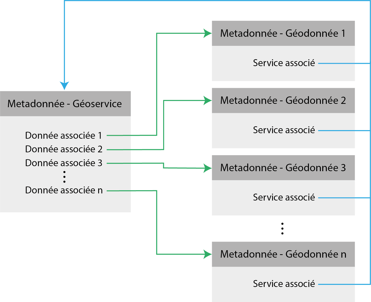 Puisqu’un géoservice est une interface de communication entre les géodonnées et les utilisateurs, il est étroitement lié aux géodonnées. Dans geocat.ch, ce lien doit également être fait entre les métadonnées du géoservice et les métadonnées des géodonnées. Ce lien doit exister dans les deux sens : géoservice <> géodonnées. Le procédé pour ajouter ce lien est expliquer dans la section E (ressources associées).