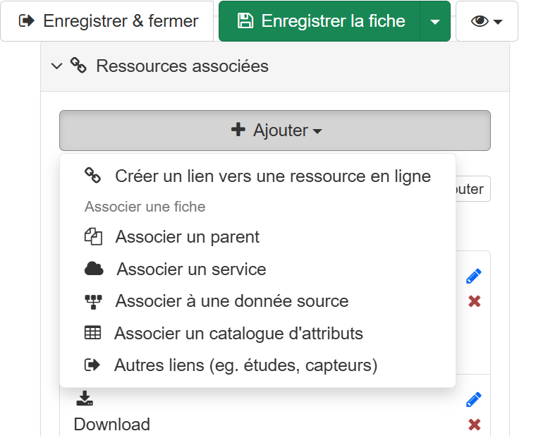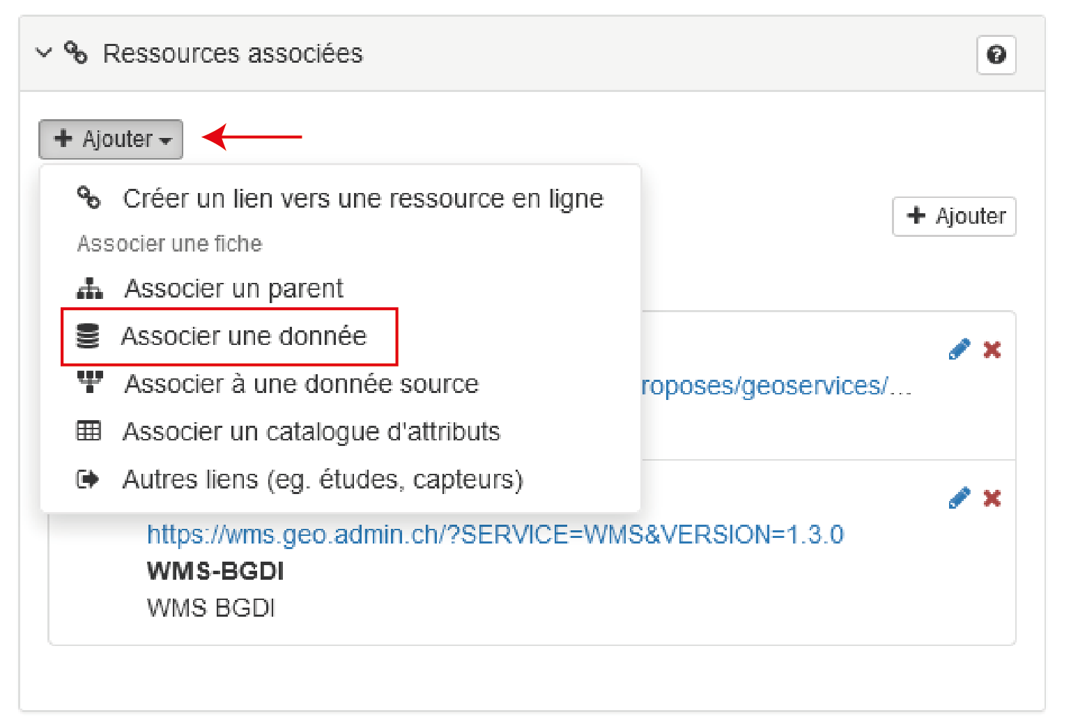 1. Dans l’encadré « ressources associées » en haut à droite dans l’édition de geocat.ch, appuyez sur « Ajouter » -> « Associer une donnée ».
