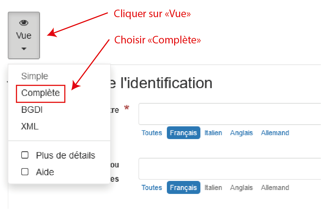 Pour avoir un contrôle optimal sur la saisie d’une métadonnée, il est recommandé de sélectionner la vue « complète » dans l’éditeur de métadonnées de geocat.ch (en haut à gauche).