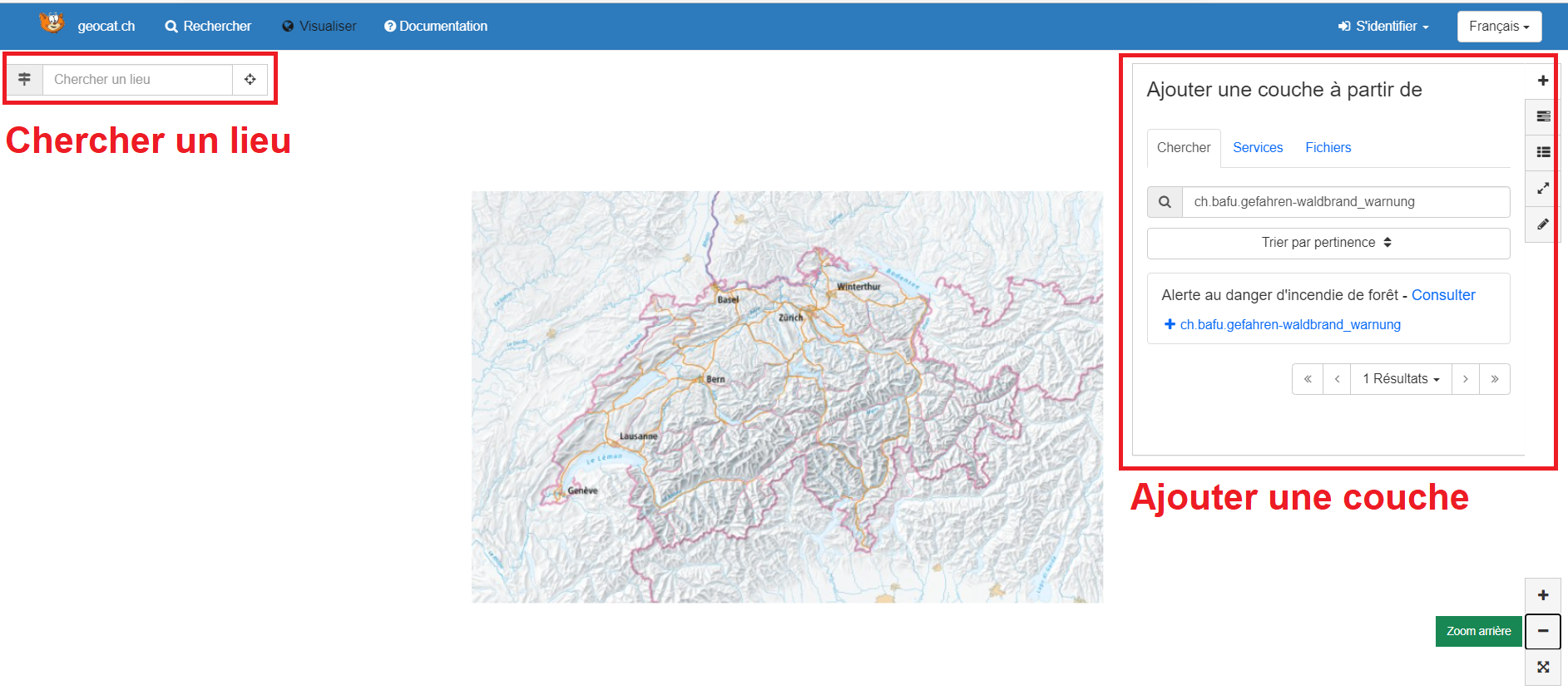 Lors de la recherche sur la carte, vous pouvez sélectionner et afficher une couche dans la colonne de droite (sous "Recherche", vous pouvez saisir un nom de couche, par ex. pour les jeux de données de l'IFDG, le nom technique de la couche) ou un service.