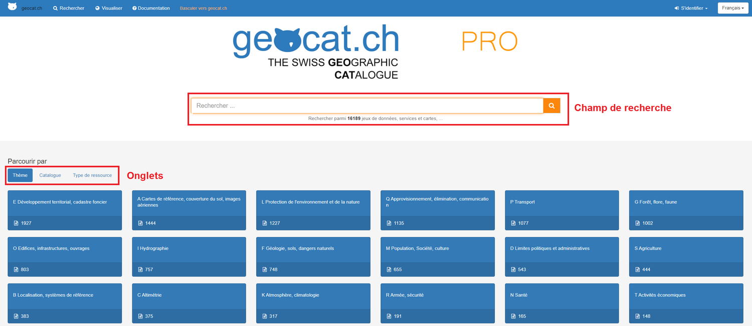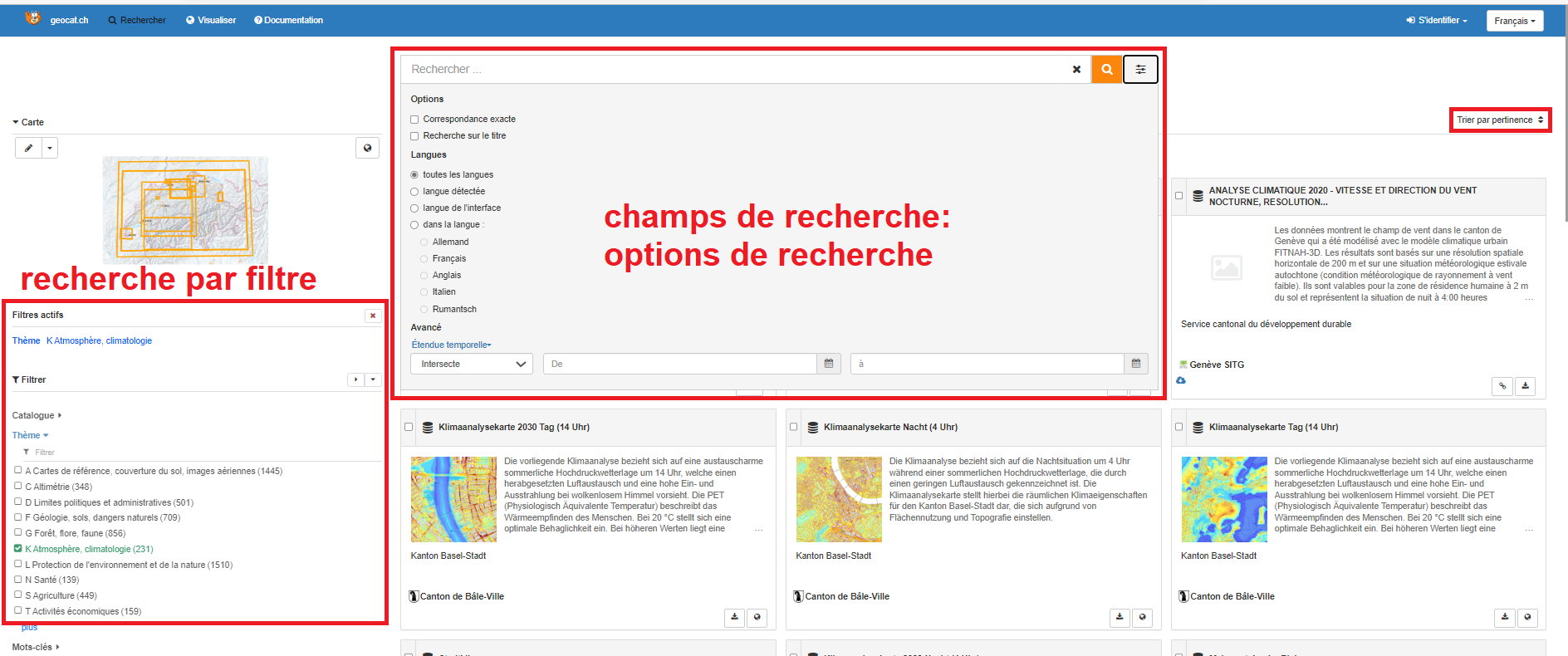 geocat.ch propose plusieurs types de recherche des métadonnées. Celles-ci sont brièvement présentées ici.
