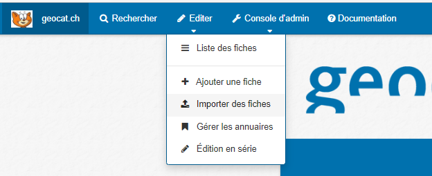 Les utilisateurs saisissent, s'ils ne le font pas déjà, les contacts, les étendues et les formats dans les répertoires correspondants. Cela se fait dans geocat.ch sous "Editer" > "Gérer les annuaires" > sélectionner le type d'élément (organisations & contacts, étendues ou formats) et "+ ajouter un élément".